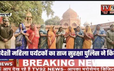 Agra : भारतीय परिधानों से सुसज्जित विदेशी महिला पर्यटकों का ताज सुरक्षा पुलिस ने स्वागत किया। Tv92News