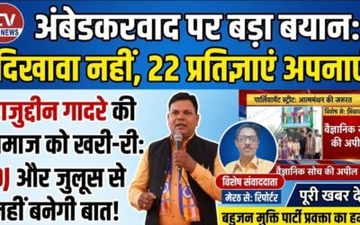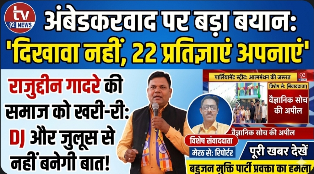 मेरठ;अंबेडकरवाद पर बड़ा बयान: जुलूस-डीजे नहीं, 22 प्रतिज्ञाएं अपनाने से बनते हैं सच्चे अनुयायीTv92News पत्रकार : अनीस सैफी 9411086221 मेरठ: मुक्ति पार्टी के राष्ट्रीय प्रवक्ता राजुद्दीन गादरे ने अंबेडकरवादी विचारधारा को लेकर एक बड़ा और अहम बयान दिया है, जिसमें उन्होंने समाज को आत्ममंथन करने की जरूरत बताई है। उन्होंने कहा कि आज के दौर…