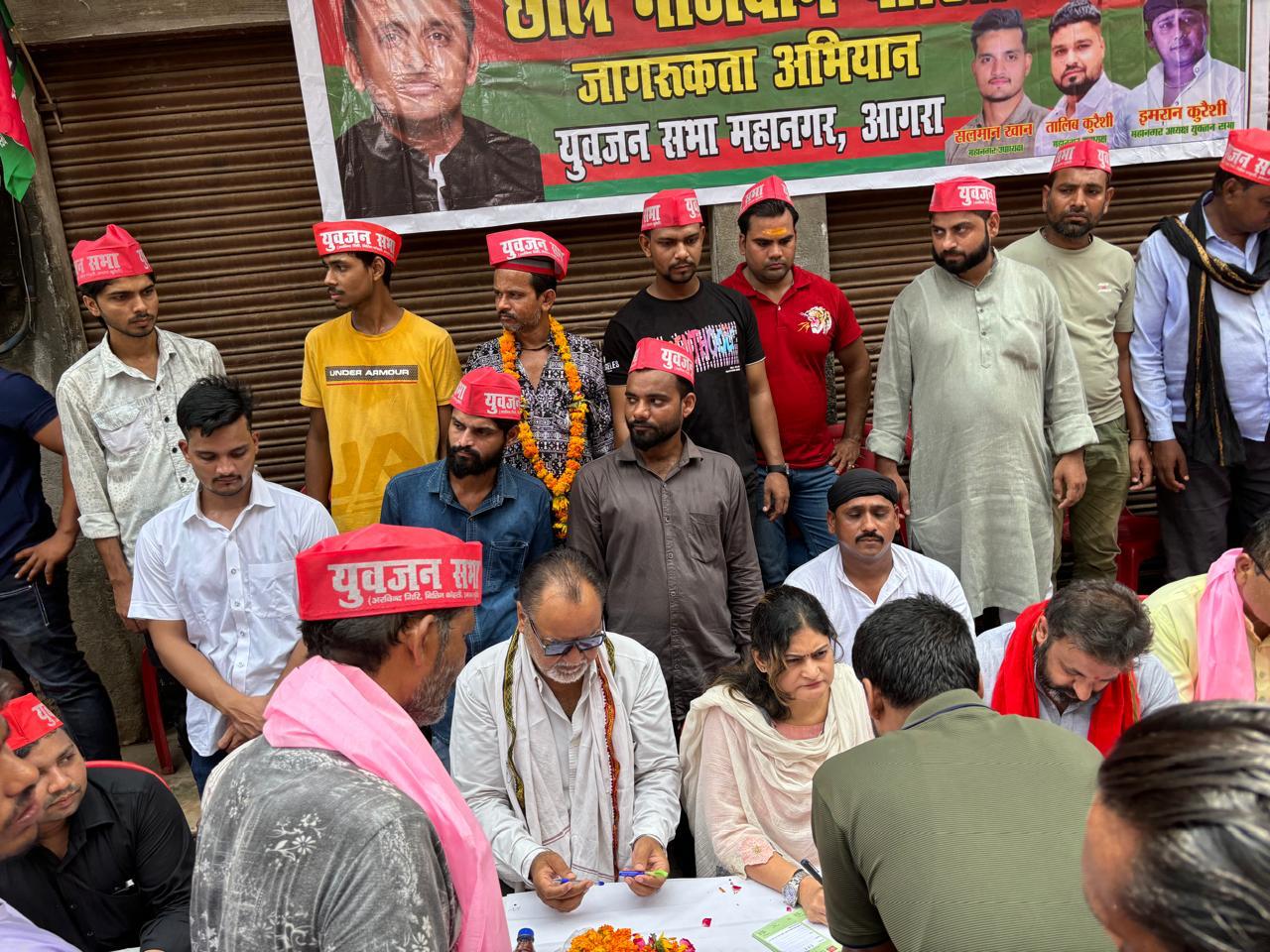 आज महानगर आगरा मे समाजवादी पार्टी के राष्ट्रीय अध्यक्ष अखिलेश यादव जी के निर्देश अनुसार युवजन सभा महानगर अध्यक्ष इमरान कुरैशी के नेतृत्व में छात्र नौजवान जागरूकता अभियान के तहत लोहा मंडी आलमगंज के अंदर एक विशेष सदस्य अभियान का आयोजित किया गया इस अभियान के तहत सैकड़ो छात्र-छात्राओं और नौजवानों ने समाजवादी पार्टी नीतियों और विचारधाराओं से प्रेरित होकर पार्टी की सदस्य ग्रहण की समाजवादी पार्टी की नीतियों सामाजिक न्याय और युवाओं के अधिकारों और देश की तरक्की मैं युवाओं की महत्वपूर्ण भूमिका पर प्रकाश डाला कार्यक्रम में मुख्य रूप से प्रदेश सचिव नितिन कोहली,