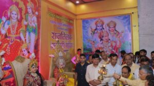 अग्रसेन वाटिका बनी अयोध्या में आयोजित राजगद्दी समारोह में धूमधाम से श्रीराम का राज्याभिषेक किया गया। श्रीराम का राजतिलक वैदिक मंत्रोच्चारण के बीच किया गया। श्रद्धालुओं के साथ मुख्य अतिथि राज्यमंत्री धर्मवीर प्रजापति, विधायक पुरुषोत्तम खंडेलवाल, संरक्षक रामकिशन अग्रवाल व संयोजक दीपक अग्रवाल ने 1100 दियो से महाआरती कर श्रीराम की वंदना की। भगवान श्रीराम का राजतिलक कर उन्हें अयोध्या की राजगद्दी सौंपी गई। भगवान श्रीराम का राजशाही तिलक का दृश्य देखने के लिए भारी संख्या में लोगों की भीड़ जुटी। राजगद्दी समारोह में स्वरूपों, मेला कमेठी और सहयोगीयो का सम्मान किया। इस अवसर पर सचिन अग्रवाल, अजय अग्रवाल, पंकज अग्रवाल, शम्भूदयाल बंसल, अजय सिंघल, प्रदीप मित्तल, विनय अग्रवाल, तरुण सिंह, महेंद्र खंडेलवाल, मोनू सिंघल आदि मौजूद रहे।