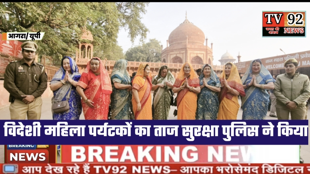 Agra : भारतीय परिधानों से सुसज्जित विदेशी महिला पर्यटकों का ताज सुरक्षा पुलिस ने स्वागत किया। Tv92News