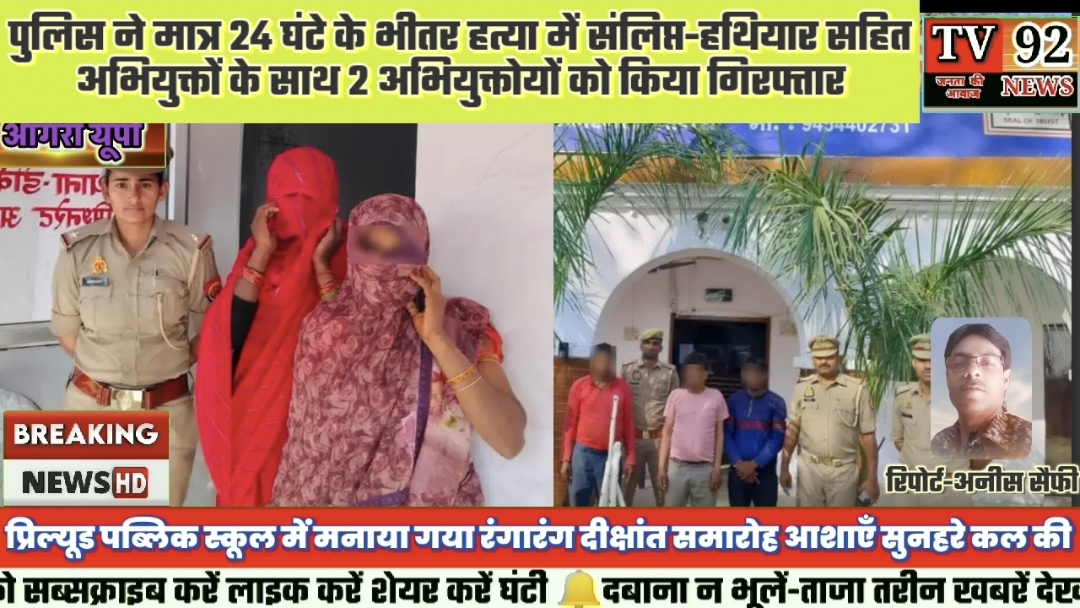 आगरा tv92news -कमिश्नरेट आगरा के डौकी पुलिस ने महज 24 घंटे के अंदर ग्राम कुई कुमरगढ़ में हुई एक हत्या के मामले में दोषी 4 अभियुक्तों और 2 महिला अभियुक्तियों को गिरफ्तार किया है, पुलिस ने अभियुक्तों की निशानदेही पर घटना में स्तेमाल 1 फावड़ा, 1 कुल्हाड़ी और 2 लकड़ी के डंडे बरामद भी किए हैं। घटना 22 मार्च 2025 को वादी राजकुमार द्वारा थाना डौकी में तहरीर दी गई थी, जिसमें बताया गया कि 22 मार्च को करीब 11:30 बजे उनके परिवार के सदस्य सियाराम, सत्यप्रकाश, बन्टी सहित अन्य व्यक्तियों से घूरा कन्डे को लेकर विवाद हुआ। इस विवाद के दौरान आरोपियों ने धारदार हथियारों से हमला कर दिया, जिसमें वादी के पिता की मृत्यु हो गई, जबकि अन्य परिवारजनों को गंभीर चोटें आईं। घायलों को अस्पताल में भर्ती कराया गया, जहां वादी के पिता को मृत घोषित कर दिया गया ,और अन्य घायलों का इलाज जारी है।