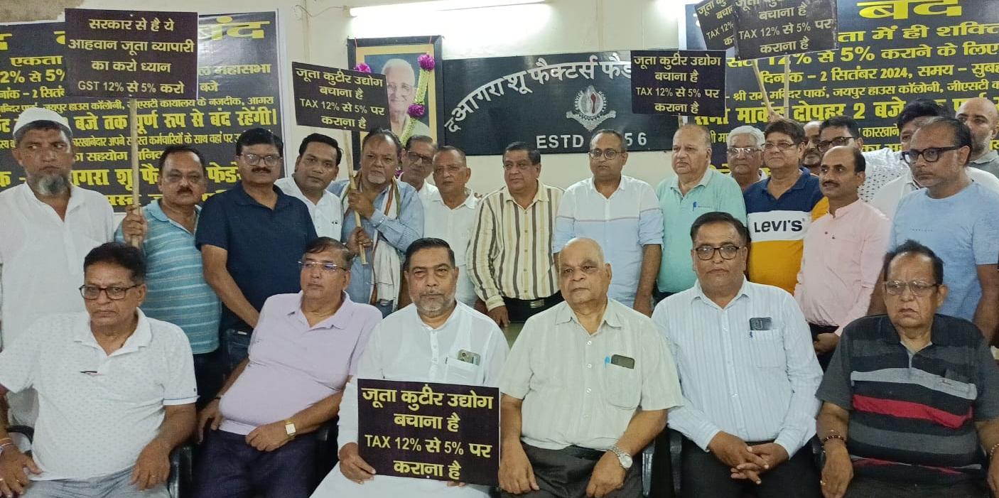 आगरा। दो वर्ष पूर्व जूते पर 5 से 12 प्रतिशत की गई जीएसटी को लेकर जूता व्यापारियों व दस्तकारों में आक्रोश बढ़ता जा रहा है। दो सितम्बर को द आगरा शू फैक्टर्स फैडरेशन के तत्वावधान में जयपुर हाउस स्थित श्रीराम पार्क में सुबह 11 बजे से विशाल अखिल भारतीय जूता संघ की महासभा आयोजित की जा रही है। जिसमें आगरा सहित देश के लगभग 12 प्रांतों के जूता संघ के पदाधिकारी व दस्तकारों, विभिन्न पंचायतों के कारीगर सहित लगभग 5 हजार से अधिक लोग अपनी मांग को ल्कर एक मंच पर जुटेंगे। आज द आगरा फैक्टर्स शू फैडरेशन के हींग की मंडी स्थित कार्यालय पर आयोजित आमंत्रण पत्र विमोचन कार्यक्रम व आम सभा में फैडरेशन के अध्यक्ष विजय सामा ने महासभा की जानकारी देते हुए कहा कि सरकार ने जूते पर जीएसटी 12 प्रतिशत स घटाकर 5 प्रतिशत नहीं की तो सड़क से लेकर संसद तक आंदोलन होगा।