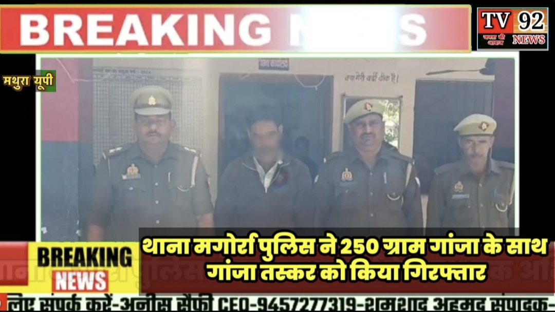 श्रीमान उप-महानिरीक्षक/वरिष्ठ पुलिस अधीक्षक महोदय जनपद मथुरा द्वारा अपराध एवं अपराधियो के विरूद्ध चलाये जा रहे अभियान के क्रम में, श्रीमान अपर पुलिस अधीक्षक महोदय (ग्रामीण) व श्रीमान क्षेत्राधिकारी महोदय गोवर्धन के पर्यवेक्षण एवं प्रभारी निरीक्षक मगोर्रा के कुशल नेतृत्व में थाना मगोर्रा पुलिस टीम द्वारा चैकिंग के दौरान एक अभियुक्त राजू पुत्र गंगा राम निवासी ग्राम ऊमरी थाना मगोर्रा जनपद मथुरा को अवैध नशीला पदार्थ गांजा के साथ आज दिनांक 24.02.2025 समय 12.20 बजे, थाना हाजा क्षेत्रान्तर्गत मथुरा भरतपुर रोड पुल से ग्राम सेहा को जाने वाले रास्ते के पास बनी कोठरी से गिरफ्तार किया गया । जामा तलाशी के दौरान अभियुक्त के कब्जे से कुल 250 ग्राम अवैध नशीला पदार्थ गांजा बरामद हुआ । गिरफ्तारशुदा अभियुक्त के विरूद्ध आवश्यक विधिक कार्यवाही की जा रही है ।