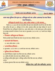 दिनांक 24.12.2024 को थाना बाह पुलिस टीम द्वारा थाना क्षेत्रान्तर्गत गश्त की जा रही थी। दौराने गश्त, पुलिस टीम द्वारा 01 अभियुक्त को मय अवैध असलाह सहित ग्राम खेड़ा देवीदास के पास से गिरफ्तार किया गया। अभियुक्त के कब्जे से 101 अदद अवैध तमंचा 12 बोर बरामद हुआ। अवैध असलाह मय कारतूस बरामदगी के सम्बन्ध में थाना बाह पर मु0अ0सं0 224/24 धारा 3/25 आर्म्स एक्ट पंजीकृत किया गया।